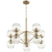 Luxurious and stunning, the modern Helios chandelier is characterized by its perfectly angled, aged brass frame and its dual, up-light/down-light sockets. With bulbs neatly housed in clear, ribbed glass orb shades for an added touch of whimsy. The overall composition is futuristic and leans mid-century modern in its styling. This striking luminary comes together harmoniously in its eye-catching geometry and luxury appeal. Hang it over any dining room table, in any entryway foyer, or living room space as a captivating and functional centerpiece.